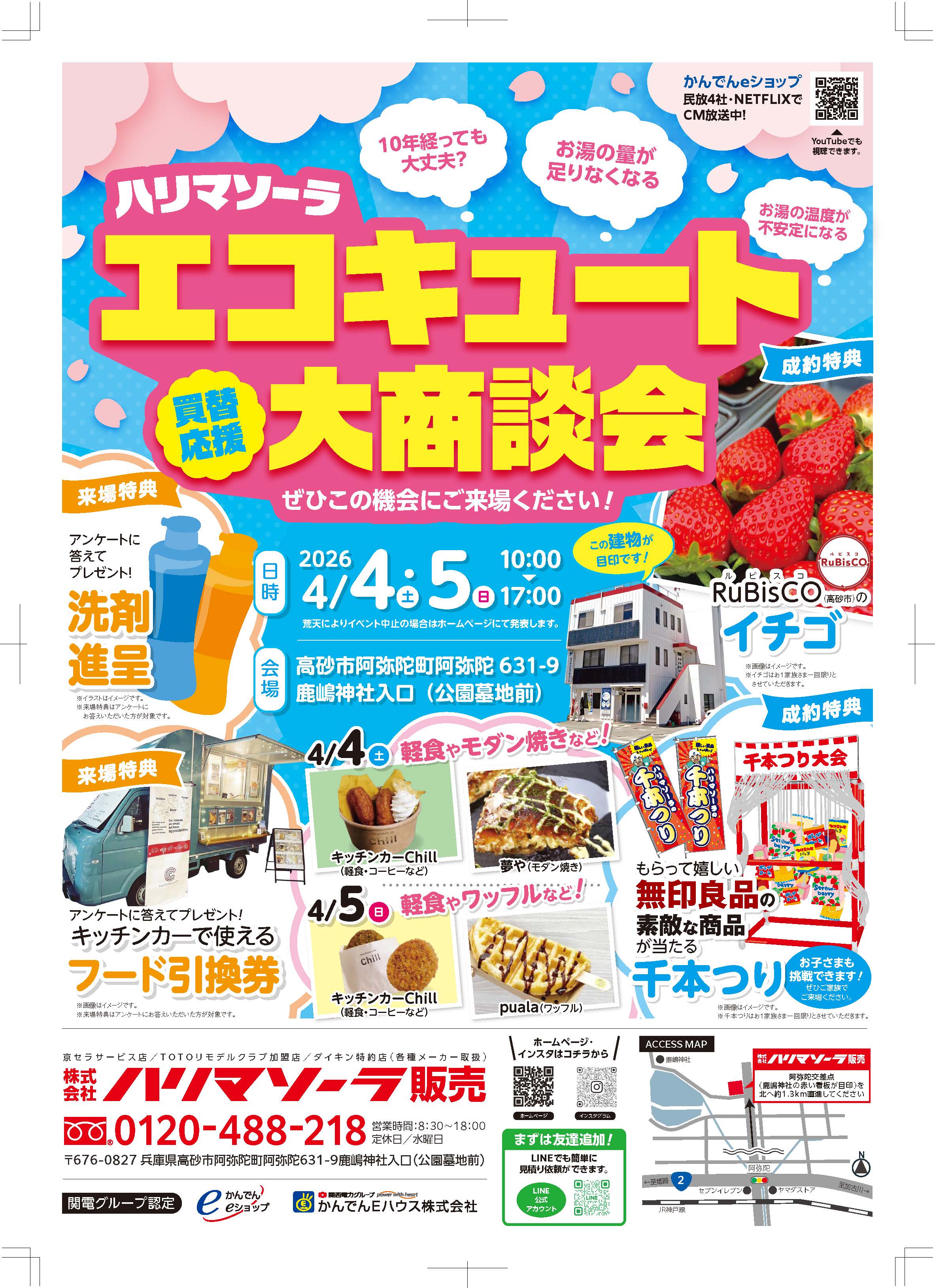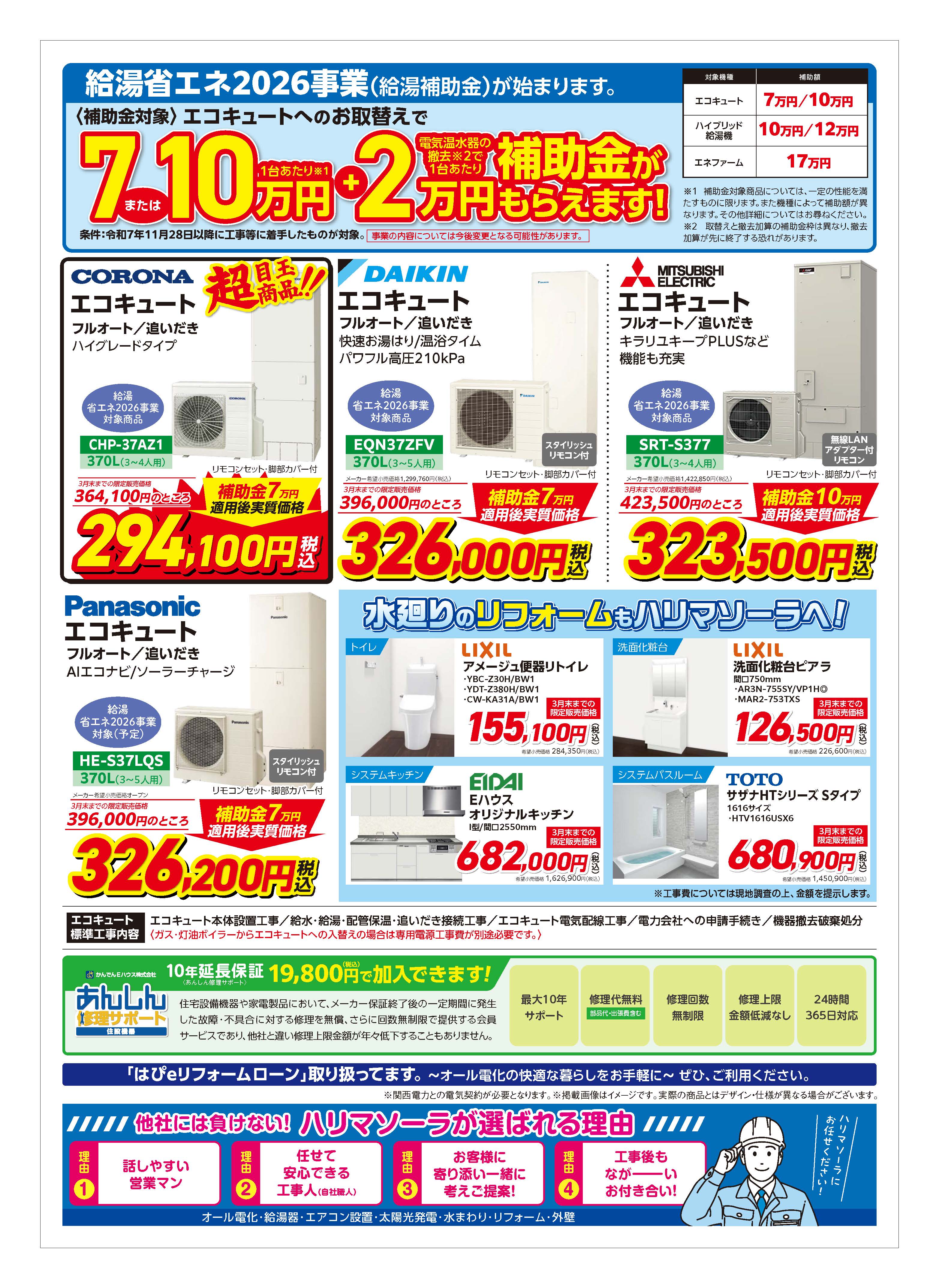 地域の皆さまと40年。ハリマソーラは地域に密着したお店です。 お客様を第一に考え、お客様のご希望やお悩み、お困りを解決できるよう全力で努めます。 ハリマソーラは、かんでんEハウスに認められた加盟店、かんでんeショップです。 「提案力・施工品質・現場マナーの良さ」をお約束するプロフェッショナルとして、お客さまに「安心・快適・経済的」な暮らしをお届けします。 給湯器・ガス給湯器が突然壊れた。お湯が出なくなった。 給湯器・ガス給湯器の修理、取付、交換工事は、安心の修理実績のハリマソーラにお任せください!